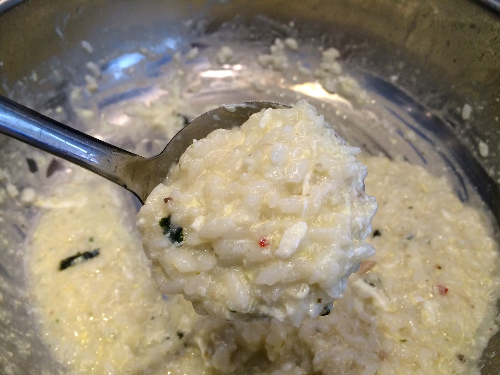 再用湯匙背不斷翻動,避免鍋巴。不出3分鐘,白米、蛋汁和海苔和麻油,全均勻混在一起。